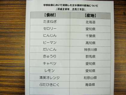 今日は、へルシーミートソースですが、みなさんは、この『ヘルシーミートソース』と『ミートソース』の違いは何かわかりますか。ヒントは、挽肉の一部を別の何かに替えていることです。わかりますか。正解は、挽き肉の一部を大豆に替えていることです。大豆は、お肉と同じで筋肉や皮膚など私たちの体をつくる働きがあります。しかし、お肉よりあぶらが少なく、頭の働きを良くしたり、血管の中の余分なものを洗い流したりする栄養も入っています。ぜひ、この栄養いっぱいのミートソースを食べて5・6年生は、明日のミュージックフェスタもがんばりましょう。