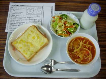今日は、コーンポテトトースト、牛乳、チーズ入りフレンチサラダ、ミネストローネスープです。