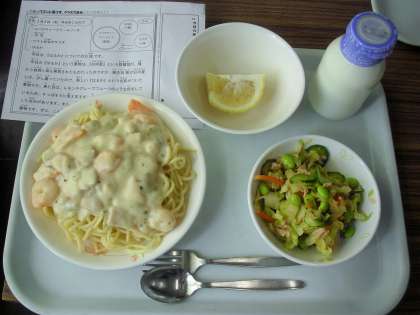 今日は、スパゲティークリームソース、牛乳、ツナと枝豆のサラダ、はるかです。