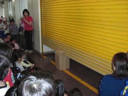 1年生は教室から直接校庭へ出るため、事前にシャッターが下りるところを見学し、シャッターが下りた場合の避難のしかたについて学びました。