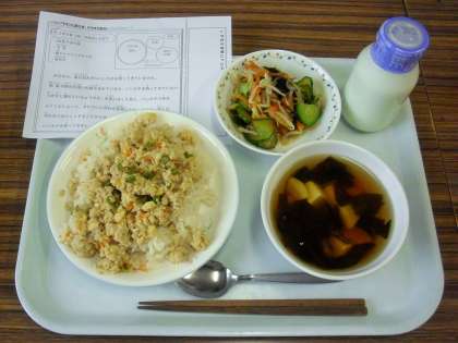 今日は、四色そぼろ丼、牛乳、梅ドレッシングサラダ、若竹汁です。