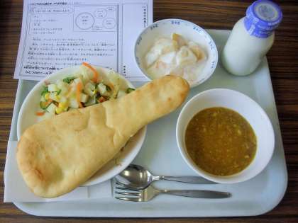 今日は、ナン、牛乳、キーマカレー、ポテト入りフレンチサラダ、フルーツヨーグルトです。