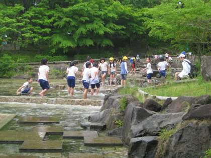 ちょっと風があり、水遊びをするにはちょっと肌寒い気温にもかかわらず、体育着に着替え、「水遊びの池」に入っていく子どもたち。
