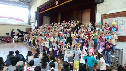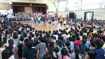 1年生へ山野小クイズの出題の後、1年生の呼びかけや歌声は、力強く立派でした。全員で校歌を歌い、素敵な歌声が体育館中に響き渡りました。