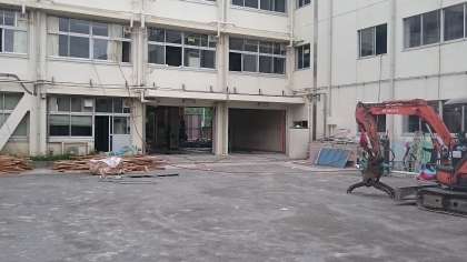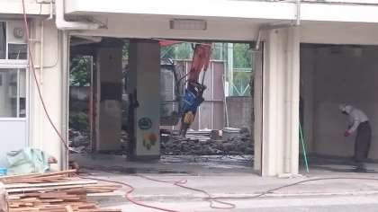 第1校庭に仮囲いができ、とうとう校舎の解体工事が始まってきています。内装の分別作業と並行して、中央校舎の昇降口が取り壊されていました。