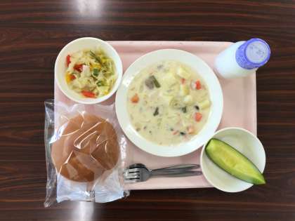 今日はミルクパンです。付け合わせはクリームシチューと、キャベツとパプリカのサラダ。フルーツにメロンが付いて、夏の始まりを感じます。牛乳も付いています。