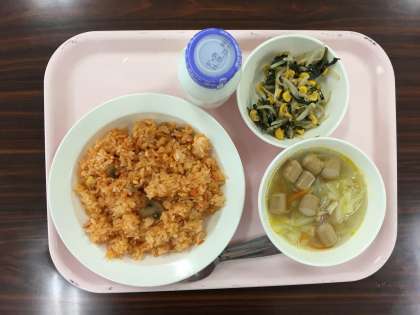 スープはウィンナーとキャベツのスープ、ほうれん草ともやしのサラダ付きです。それと牛乳です。