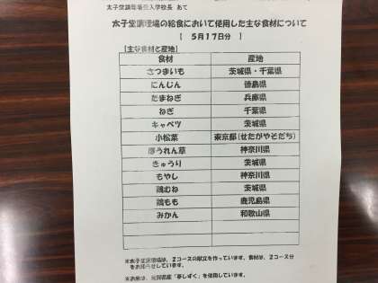 食材表の主な食材が昨日と同じなのですが、これは2コースの献立を交互に作っているから2日間同じになることがあるのだそうです。よく見ると、産地が違うものもあります。