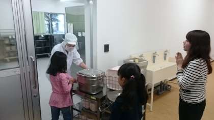 配膳室は、各校舎の1,2階にあります。給食センターからは、トラックですでにクラス毎に食缶などに分けられて積まれてきます。それを配膳員さんたちが、さらにクラス毎に配膳台に分けていきます。このようにして温かくておいしい給食が提供されています。