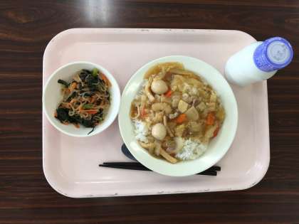 今日は中華丼です。付け合わせは、しらたきが入った小松菜サラダです。牛乳も付いています。