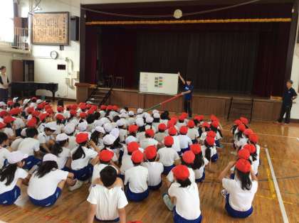 写真は、2年生の準備運動、3年生の棒引きのオリエンテーションです。