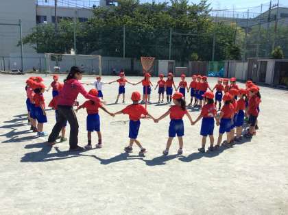 1年生が第2グラウンドで、ダンシング玉入れの練習をしています。