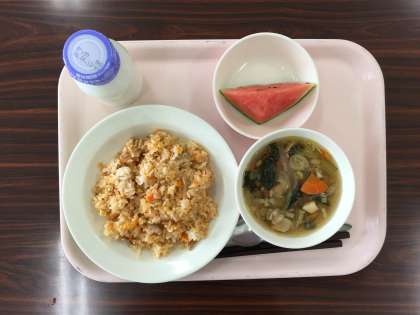今日は、キムチチャーハンです。ほんのりとしたキムチの辛味が食欲をそそります。スープは春雨スープ、フルーツのスイカは、今年初めての人が多いと思います。牛乳も付いています。