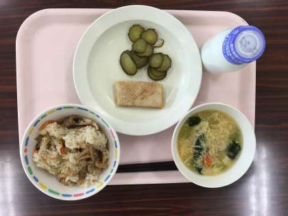 で、しかの子のことですが、表面に細かい切込みで格子模様を付けて焼くのをかのこ焼きというそうです。かき玉汁ときゅうりの甘酢和え、牛乳が付いています。