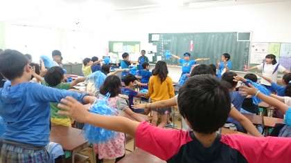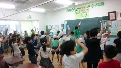 今回の応援練習は、学級ではなくて、縦割り班で活動している教室で行いました。応援団もよく声が出ていますが、その他の子どもたちも体をいっぱい動かして声もよく出ています。