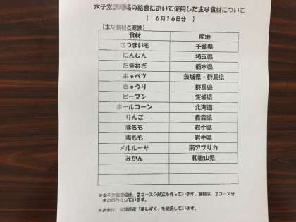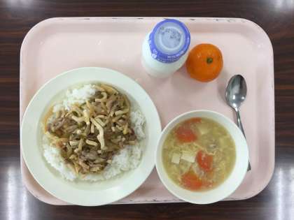 の料理だということです。今日の給食は岩手県産の豚もも肉です。冷凍みかんと牛乳が付いています。