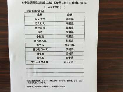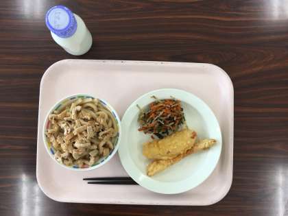 今日は揚げがたっぷりの、きつねうどんです。えびと笹かまぼこの天ぷら付きです。竹輪の磯辺揚げはよくありますが、笹かまぼこの天ぷらはあまり馴染みがないですね。野菜ののり和えと牛乳も付いています。