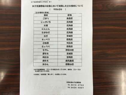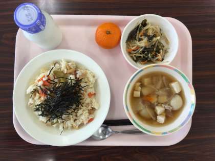 今日は、「かしわずし」です。あまり聞かない献立だと思いますが、鶏肉を入れたちらし寿司です。けんちん汁、ごまドレサラダ、冷凍みかん、牛乳が付いています。