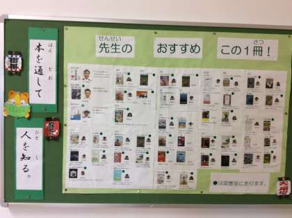 現在は、先生のおすすめ本が掲示されています。ご来校の際には、ぜひ図書室にお立ち寄りください。