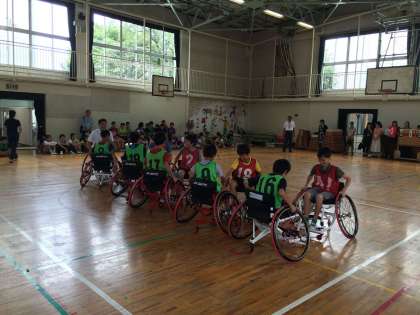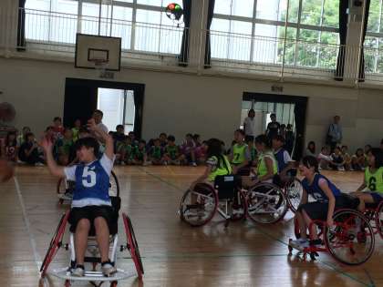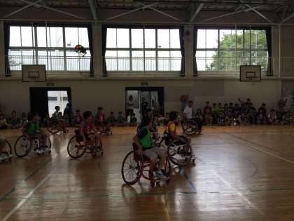 車椅子バスケット、アトランタ、シドニー、アテネパラリンピックの日本代表選手、三宅克己選手を講師にお招きして、車椅子バスケットの体験をしています。なかなか、思うように車椅子の操作ができませんが、みんな一生懸命です。