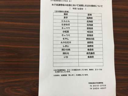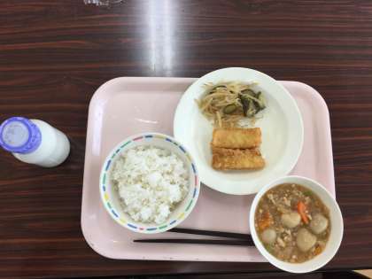 今日は、ごはんです。おかずは、いかのかりん揚げ、きゅうりともやしのごま酢和え、里芋のそぼろ煮、牛乳です。いかのかりん揚げは、給食ではポピュラーなメニューです。「かりん」は果物の花梨ではなく、見た目がお菓子の「かりんとう」に似ているからだそうです。