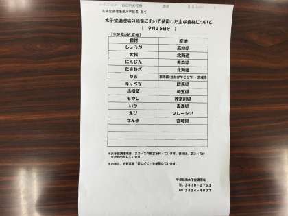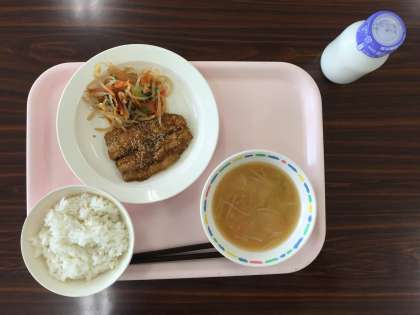 今日は、ごはんとさんまのかば焼きです。かば焼きという名称は、植物の蒲(がま)に由来すると言われています。さんまは小骨の多い魚ですが、給食では殆どの骨を取り除いています。みそ汁、からし和え、牛乳も付いています。