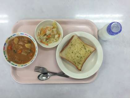 今日はガーリックトーストです。ガーリックの香りが食欲をそそります。付け合わせはポークときのこのシチュー、りんごサラダですが、私はこの書き込みをするまで、りんごとは気が付きませんでした。牛乳も付いています。