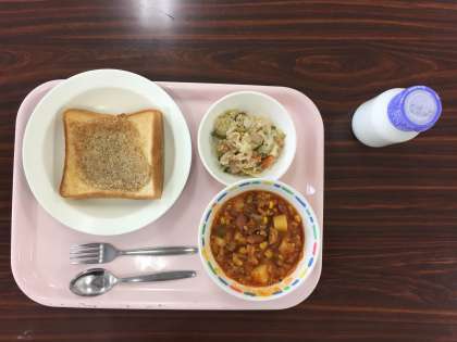 今日はセサミトーストとチリコンカンです。チリコンカンとか普通に聞いてもチンプンカンですが、両方とも給食ではポピュラーなメニューのようです。セサミトーストは、食パンにバター、グラニュー糖、白ごまを混ぜて乗せたもの、チリコンカンは豚ひき肉赤インゲン豆、野菜のトマト煮込みです。ツナサラダ、牛乳も付いています。
