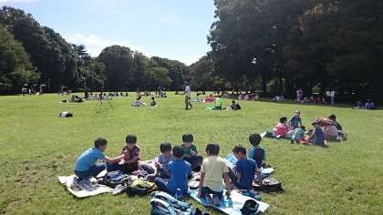 砧公園へバスで移動し、お昼です。声を掛け合って仲よくお弁当を食べています。
