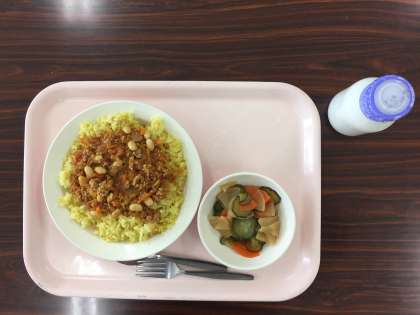 今日は大豆入りドライカレーとシャキシャキ野菜です。大豆入りドライカレーは、ご飯にもカレー味が付いて、とても美味しく、ついつい食べ過ぎてお腹がいっぱいになります。牛乳も付いています。