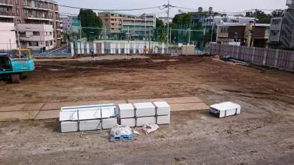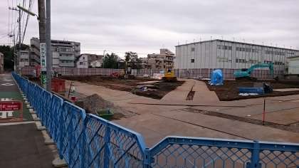 仮囲いが一旦取り除かれたので、道路から敷地がよく見渡せます。地盤の改良工事がすすんでいます。