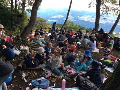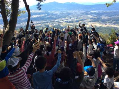 全員での登頂成功を祝って、頂上でガッツポーズをしました。お弁当も美味しかったです。