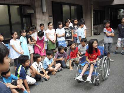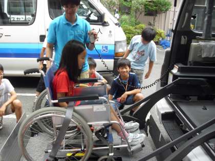 また、砧デイサービスでは、車いすの方が乗れる車の説明のところで、子どもが車いすに乗り、どのように車に乗るのかを体験することができました。