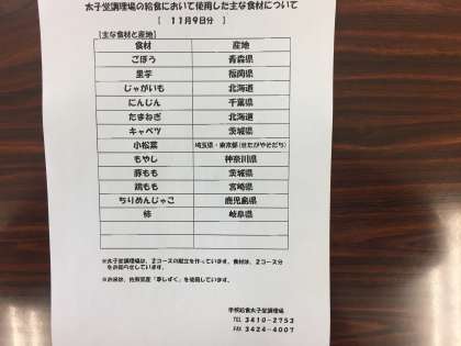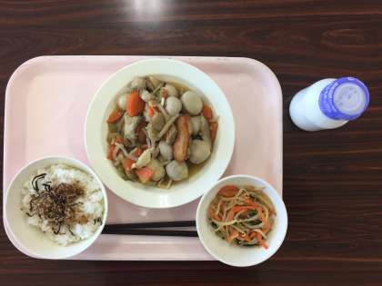 今日はご飯です。カミカミ佃煮、鶏と里芋のうま煮、からし和え、牛乳が付いています。カミカミ佃煮は、健康な歯を保つためによく噛んで食べようということで、硬めの佃煮になっています。これを食べて喋っても、カミカミにはなりません。