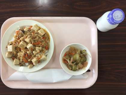 今日は、麻婆豆腐丼です。ヘルシーサラダと牛乳が付いています。麻婆豆腐は、とろみが少なくて、あっさりした感じです。ヘルシーサラダは、こんにゃく、きゅうり、もやしの中華風味付けです。