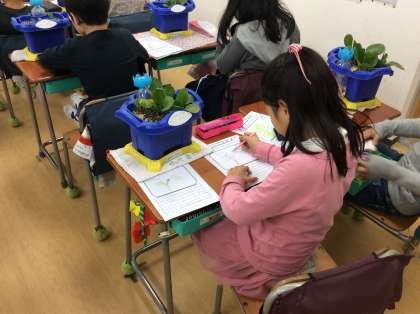 小松菜が育ってきました。熱心に観察をしています。