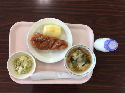 今日は、揚げパン、ワンタンスープ、ハムサラダ、りんご、牛乳です。揚げパンは昔から給食の人気メニューで私も好きでしたが、最近は給食に出る頻度が少なくなっていると思いませんか?元々、欠食児童対策だった給食で、栄養価を高めるために作ったメニューですが、その栄養価の高さ故に、今ではカロリーオーバーとなり、出る頻度が少なくなってしまったようです。