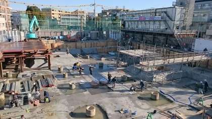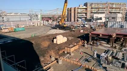 敷地の中央に鉄骨で組まれた台ができてきました。ここは、しばらく工事車両の駐車場所になるそうです。地面は、コンクリートが流し込まれて土台がつくり進められています。