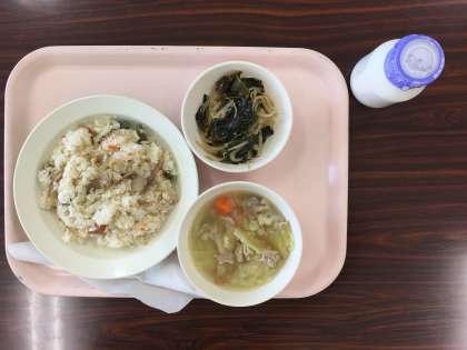 今年最初の給食は、鶏とごぼうのピラフ、田舎風豆スープ、もやしとわかめのゴマドレッシング、牛乳です。