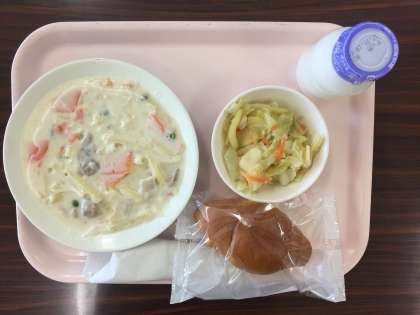 今日は、バターロールパン、マカロニのクリーム煮、りんごサラダです。マカロニのクリーム煮は、給食の定番で、人気のメニューです。焼かないマカロニグラタンという感じですね。バターロールパンは、国産小麦粉を使っているそうです。ロールパンはクリーム煮との相性が良く、とても美味しいです。