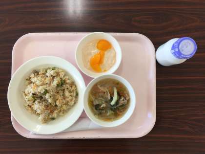今日は中華です。チャーハン、白菜と春雨のスープ、愛玉子ゼリー、牛乳。愛玉子(オーギョーチー)は、台湾のスィーツで私も大好きです。バーミャンのメニューにもありますが、私が初めて食べたのは、三軒茶屋の小さなカレー屋さんでした。本来は愛玉子(あいぎょくし)という植物の葉を使って作るのですが、給食の愛玉子は色も食感も全く別物のように思います。