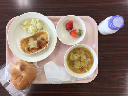 今日はパインパン、魚のピザ焼き、ベーコンと野菜のスープ、粉ふきいも、いちご、牛乳です。この献立の中で、ちょっと違和感があるのが、「魚のピザ焼き」です。献立に魚がある場合、普通は魚の種類を書きますよね。ししゃものから揚げとか、鮭のちゃんちゃん焼きとか。今日の魚は、南アフリカ産のメルルーサです。名前はあまり知られてないのですが、外食で白身魚と言っているのは、大概、メルルーサなので、ほとんどの人が食べていると思います。美味しい魚なので、「メルルーサのピザ焼き」と言ってあげたいです。