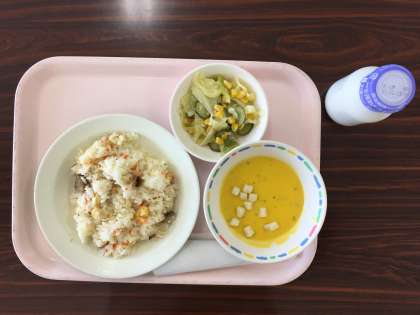 今日はシーフードピラフです。かぼちゃのポタージュスープ、せん切りサラダ、牛乳が付いています。かぼちゃは、北海道産です。国内で流通しているかぼちゃの50パーセント以上は北海道産のようです。じゃがいもは80パーセント近くが北海道産ということです。毎年、秋になると北海道の叔父から、じゃがいもとかぼちゃが送られて来ます。かぼちゃは切るのが大変なので、私の役目です。かぼちゃの原産国は、カンボジアではなく、アメリカ大陸です。コロンブスの大陸発見により、ヨーロッパに伝わったものが、カンボジア経由で日本に来たということのようです。