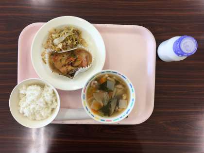 さて、今日は和食ですね。ごはん、鮭のちゃんちゃん焼き、のっぺい汁、白菜のおかか和え、牛乳。のっぺい汁は、あまり馴染みが無いと思いますが、農林水産省選定「農山漁村の郷土料理百選」に選ばれた新潟の郷土料理らしいです。新潟では正月やお盆などの年中行事に欠かせない料理のようです。