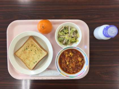 今日はガーリックトーストにチリコンカン。アメリカンなメニューです。チリコンカンは、チリ(唐辛子)が入ってないので、コンカンかな?まあ、給食ですからね。