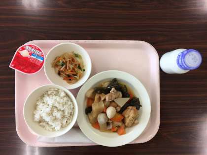 今日はじゃこごはん、おでん、からし和えです。具材はおでんの具材なのですが、細かく切ってあるので、うま煮と言った方が良い感じです。おでんのうま煮…。デザートは雪見だいふくです。和食か…。牛乳も付いています。