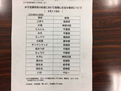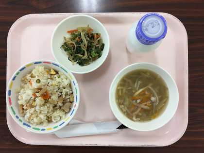 今日は五目寿司、沢煮碗、ごま和え、牛乳です。