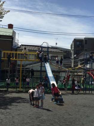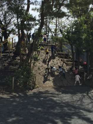 山野の山と固定遊具で元気に遊ぶ子どもたち。