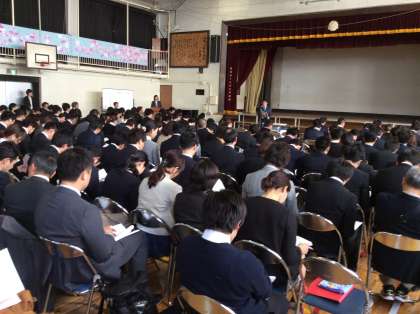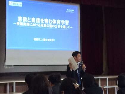 世田谷区に勤務する先生の中で、体育科を研究している200名を超える先生たちが山野小に集まっています。先生たちもしっかり勉強しています。