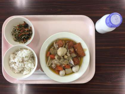 今日は、じゃこご飯です。おかずは、鶏と里芋のうま煮、野菜ののり和えです。それといつもの牛乳。うま煮の盛りが半端じゃないです。